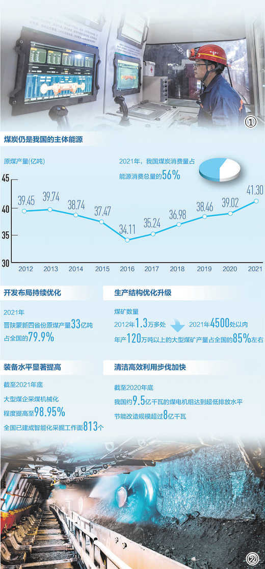 百米深井,一臺滾筒直徑達(dá)3.5米的采煤機開采2500噸煤炭;繁忙港口,一臺四翻式翻車機卸載100節(jié)火車皮;工業(yè)園區(qū),兩臺660兆瓦燃煤機組生產(chǎn)電能132萬千瓦時,滿足6600戶家庭1個月的用電需求……煤炭保障著經(jīng)濟社會發(fā)展和民生用能需求。2021年,我國原煤產(chǎn)量達(dá)41.3億噸,煤炭消費量占能源消費總量的56%,煤炭仍是我國的主體能源。