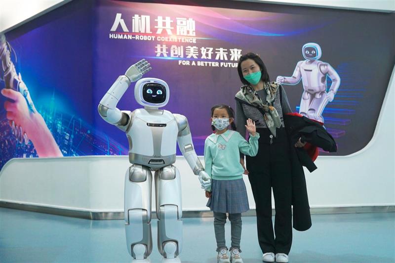 人形機(jī)器人在中科館與小朋友和家長合影互動(dòng)。鄭雪雄 攝