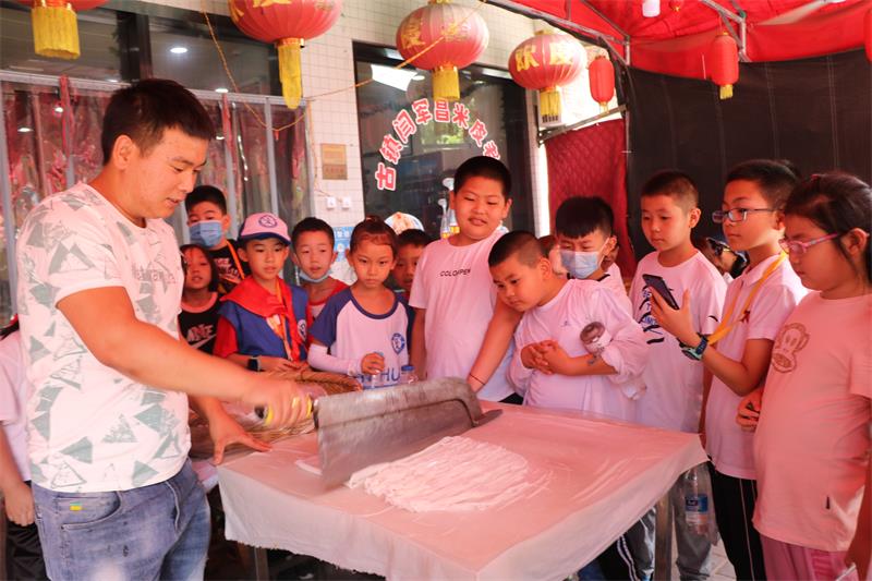 中午,小記者們走進(jìn)了聞名遐邇的秦渡古鎮(zhèn),在特色米皮老店,小記者走進(jìn)廚房,近距離參觀涼皮的蒸制、刀切、調(diào)味和小油糕的油榨制作工藝,并品嘗三秦套餐美食。