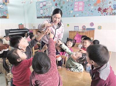 郭文艷在和孩子們做游戲。資料圖片