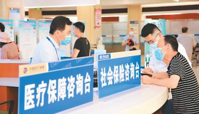 安徽省銅陵市社保中心積極對接市醫(yī)保中心,就參保登記、社會保險關(guān)系轉(zhuǎn)移接續(xù)等涉及不同部門的事項設(shè)置“聯(lián)辦”服務綜合窗口,方便群眾辦理社保、醫(yī)保不同事項。圖為市民日前在銅陵市政務服務中心大廳咨詢醫(yī)保、社保事項。潘 偉攝(人民圖片)
