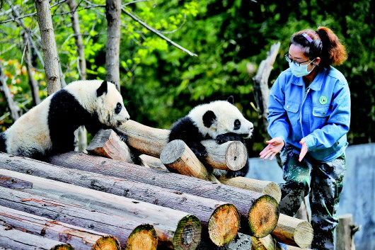 在陜西省林業(yè)科學(xué)院秦嶺大熊貓繁育研究中心,工作人員與大熊貓互動。 新華社資料片