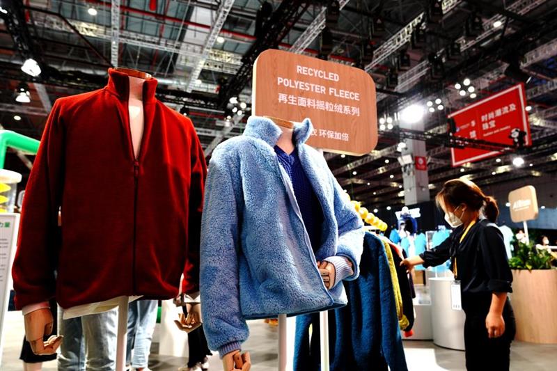 優(yōu)衣庫參展人員在第五屆進博會上介紹參展的環(huán)保服裝,該服裝面料采用源自回收塑料瓶的再生聚酯纖維。新華社記者張建松 攝