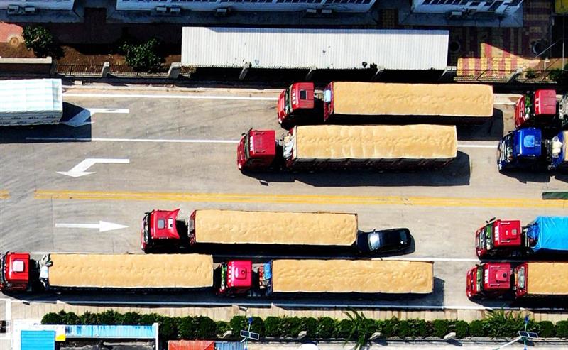 ??6月15日,在山東省臨沂市平邑縣一處糧食儲備庫夏糧收購現(xiàn)場,運(yùn)輸車輛排隊(duì)售糧(無人機(jī)照片)。新華社發(fā)(武紀(jì)全 攝)