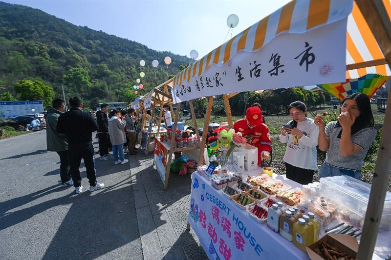 ↑4月8日,浙江省諸暨市趙家鎮(zhèn)東溪村舉行的春日山野市集設(shè)置免費(fèi)攤位,推廣優(yōu)質(zhì)農(nóng)副產(chǎn)品以及網(wǎng)紅美食,吸引游客前來了解選購。