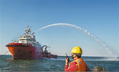 近日,曹妃甸液化碼頭附近海域,海洋工作船正在進(jìn)行消防演練。 |