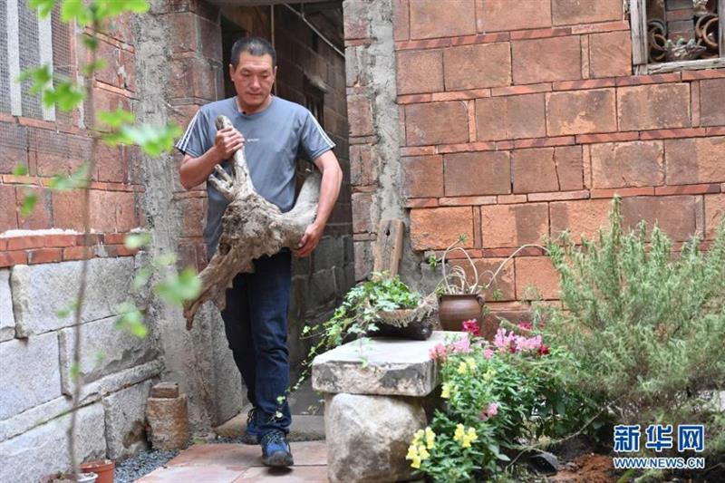 4月19日,蔡競(jìng)翔在被改造為海漂藝術(shù)品陳列館的老宅里搬運(yùn)一塊海灘撿來(lái)的樹根。