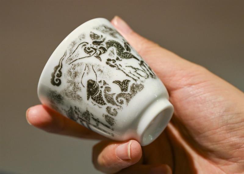 ??在浙江臺(tái)州仙居縣白塔鎮(zhèn)上葉村仙居巖畫(huà)藝術(shù)中心內(nèi),工作人員展示根據(jù)當(dāng)?shù)貛r畫(huà)開(kāi)發(fā)的文創(chuàng)禮品(7月28日攝)。新華社記者 李賀 攝