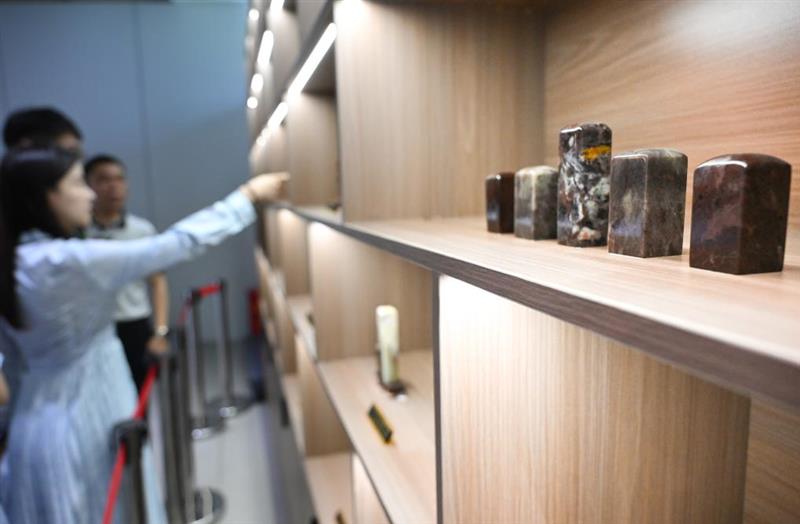 ??在浙江臺(tái)州仙居縣白塔鎮(zhèn)上葉村仙居巖畫(huà)藝術(shù)中心的展柜上擺放著用當(dāng)?shù)厥闹谱鞯挠≌挛膭?chuàng)品(7月28日攝)。新華社記者 李賀 攝