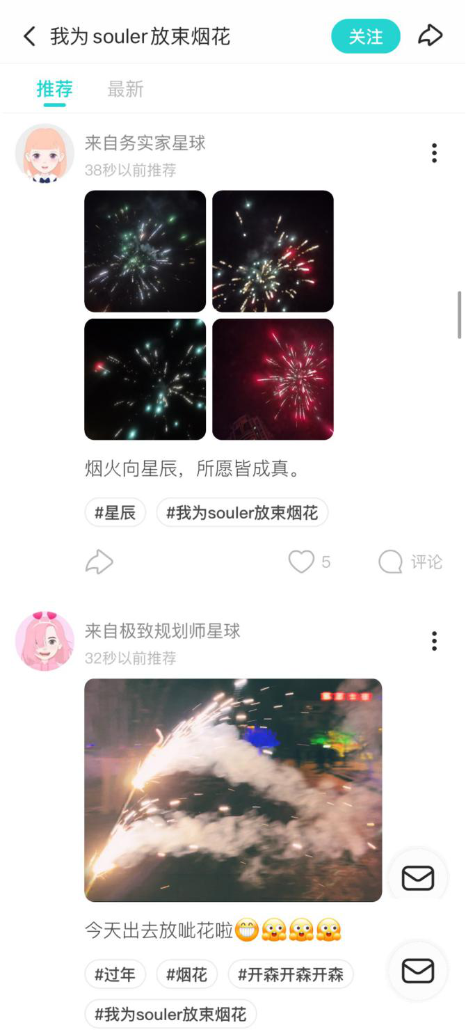 在Soul“一起過節(jié)”的溫暖,還體現(xiàn)在那些隨手分享的生活點(diǎn)滴中。春節(jié)7天期間,超過5萬人在Soul曬出自己所在地夜空的煙花,參與人數(shù)在除夕當(dāng)晚達(dá)到峰值。在“我為souler放束煙花”話題下,就地過節(jié)的年輕人與好友們看遍全國各地的姹紫嫣紅,在一場盛大的“煙花匯演”中度過了一個(gè)難忘的大年夜。