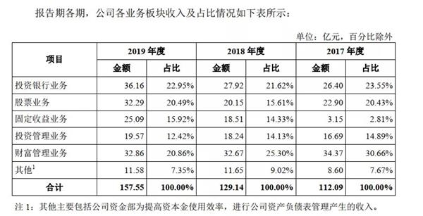 招股書(shū)顯示,報(bào)告期內(nèi),公司業(yè)務(wù)結(jié)構(gòu)日益均衡,并保持良好的發(fā)展勢(shì)頭,抵御市場(chǎng)波動(dòng)和防范風(fēng)險(xiǎn)的能力不斷增強(qiáng)。2019 年,公司實(shí)現(xiàn)營(yíng)業(yè)收入157.55億元,投資銀行業(yè)務(wù)、股票業(yè)務(wù)、固定收益業(yè)務(wù)、投資管理業(yè)務(wù)和財(cái)富管理業(yè)務(wù)五大業(yè)務(wù)板塊的收入占比分別為22.95%、20.49%、 15.92%、 12.42%及 20.86%。