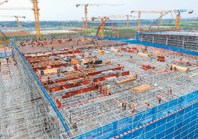 在四川彭山經(jīng)濟(jì)開發(fā)區(qū)計(jì)劃總投資100億元的中創(chuàng)新航動(dòng)力電池及儲(chǔ)能系統(tǒng)眉山基地項(xiàng)目建設(shè)現(xiàn)場(chǎng),工人們正搶抓廠房建設(shè)。