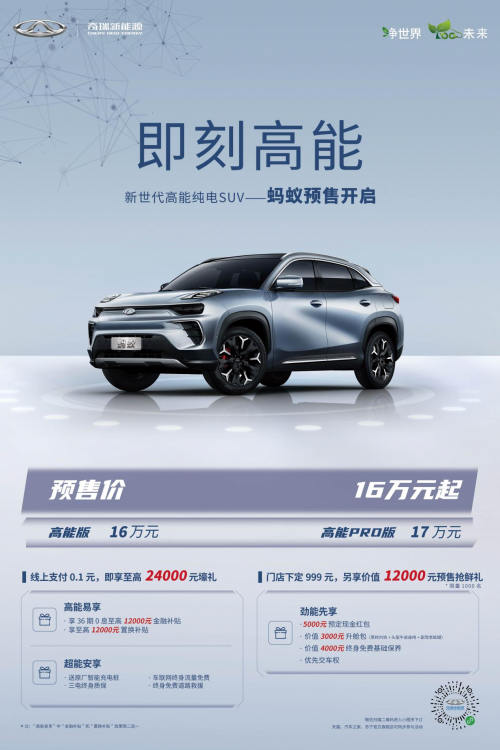 此次官宣預售包括2個版型,分別是高能版、高能Pro版,預售價格為16萬元起。除了超乎預期的價格,奇瑞新能源還推出了線上、門店雙重購車福利,線上只需支付0.1元即享至高24000元壕禮,包括高能易享、超能安享等多種優(yōu)惠政策;門店下定999元,另享價值12000元預售搶鮮禮,限量1000名,勁能先享優(yōu)惠政策。多種優(yōu)惠福利組合,極大降低用戶購車門檻,同時輔以多重貼心服務,盡顯滿滿誠意。