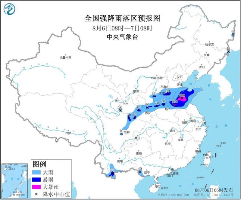 預計,8月6日08時至7日08時,甘肅東南部、陜西中南部、華北南部、黃淮中北部、四川盆地西部、云南南部、廣西南部等地的部分地區(qū)有大到暴雨,其中,河南東部、山東中西部等地局地有大暴雨(100~200毫米)。上述部分地區(qū)伴有短時強降水(最大小時降雨量30~50毫米,局地可超過70毫米),局地有雷暴大風等強對流天氣。