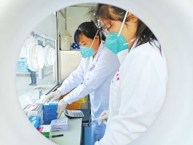 醫(yī)護(hù)人員在診療點(diǎn)整理藥品記者李玉坤攝影