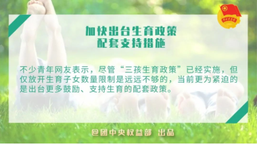 不少青年網(wǎng)友表示,盡管“三孩生育政策”已經(jīng)實(shí)施,但僅放開生育子女?dāng)?shù)量限制是遠(yuǎn)遠(yuǎn)不夠的,當(dāng)前更為緊迫的是出臺更多鼓勵(lì)、支持生育的配套政策。