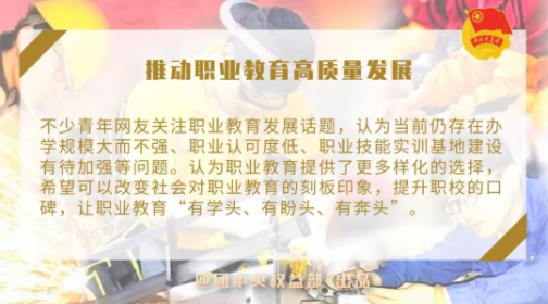 不少青年網(wǎng)友關(guān)注職業(yè)教育發(fā)展話題,認(rèn)為當(dāng)前仍存在辦學(xué)規(guī)模大而不強(qiáng)、職業(yè)認(rèn)可度低、職業(yè)技能實(shí)訓(xùn)基地建設(shè)有待加強(qiáng)等問題。認(rèn)為職業(yè)教育提供了更多樣化的選擇,希望可以改變社會(huì)對職業(yè)教育的刻板印象,提升職??诒?,讓職業(yè)教育“有學(xué)頭、有盼頭、有奔頭”。