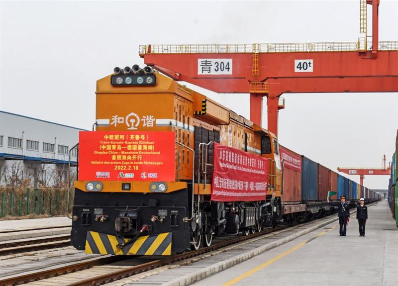 2月18日,中歐班列(齊魯號(hào))中國(guó)青島—德國(guó)曼海姆雙向?qū)﹂_首班列車從上合示范區(qū)青島多式聯(lián)運(yùn)中心出發(fā)。(新華社發(fā),王昭脈 攝)