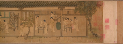 中國是農(nóng)業(yè)大國,一直十分重視農(nóng)桑,古典文藝作品中自然有不少表現(xiàn)蠶桑勞作或描寫蠶婦織女的現(xiàn)實生活。南宋畫家牟益的紙本水墨畫《搗衣圖》繪南朝詩人謝惠連《搗衣詩》之詩意,畫中庭院秋深,32位女子搗練、裁衣、縫衣、寄衣,到卷尾緩緩展現(xiàn)全卷主題:“紈素既已成,君子行未歸。裁用笥中刀,縫為萬里長。盈篋自余手,幽緘俟君開”,不僅呈現(xiàn)了從搗制衣料到裁衣、寄衣的完整過程,也生動形象地表達了她們良人從軍久不歸的閨怨哀傷——“搗衣”是六朝和唐代詩畫的常見題材,指將生絹等衣料鋪在平滑的砧板上,用木棒敲至柔軟熨貼,以便于剪裁縫制衣服,而并非望文生義的“用木棒敲打清洗衣服”之意。勤勞的蠶婦織女們創(chuàng)造了絢爛多姿的絲綢產(chǎn)品,五代十國時期南唐畫家顧閎中的《韓熙載夜宴圖》絹本設色,工整精細地描繪了高官顯宦之家晚宴歡會的場景,其中的仕女們綺羅錦繡,衣袂鮮潔,絢中出素,嫵媚高雅,簾幕和帳幔也無不是絢麗多彩的絲綢制品。
