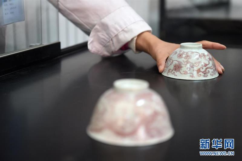 12月24日,在圓明園管理處考古工作站,工作人員在擺放已修復的瓷器。