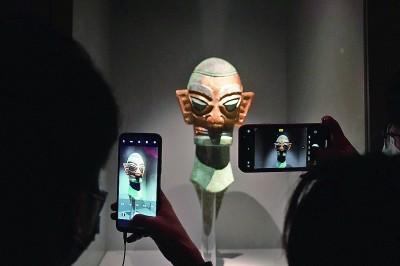參觀者在三星堆博物館參觀金面銅人頭像。新華社發(fā)