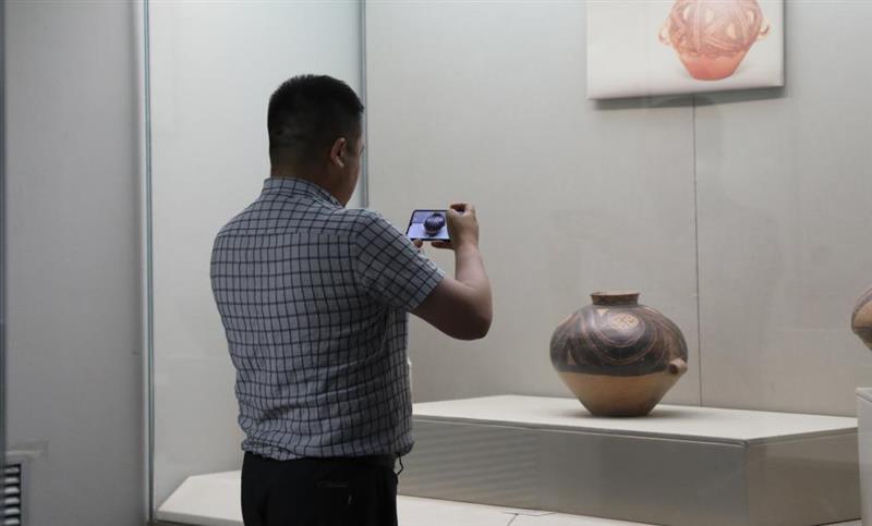 6月19日,觀眾觀賞拍攝馬家窯文化彩陶珍品展上的展品。新華社記者馬莎攝