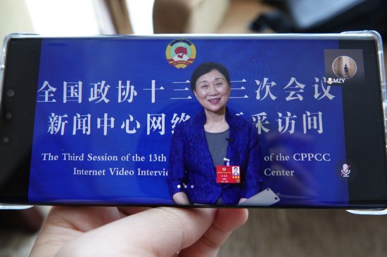 20日,記者通過手機(jī)觀看全國(guó)政協(xié)委員接受采訪。