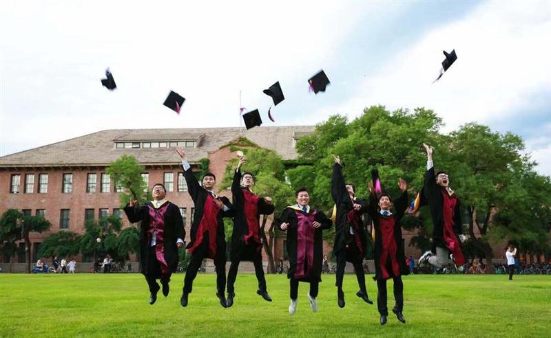 畢業(yè)生在草坪上拋起學(xué)士帽。圖片由清華大學(xué)提供