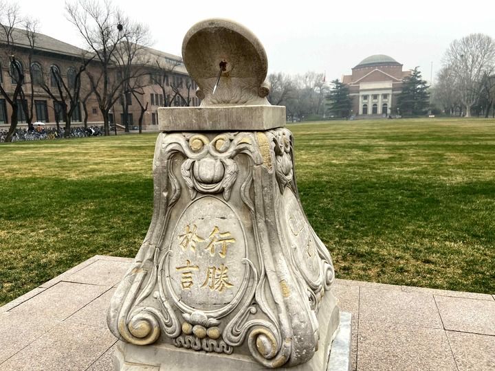 3月26日,清華大草坪上鐫刻著“行勝于言”銘文的日晷。(記者魏夢(mèng)佳攝)