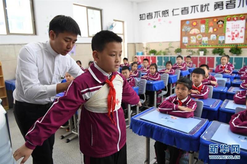 5月11日,在貴陽(yáng)市南明區(qū)花果園第三小學(xué),老師給學(xué)生講解包扎處理的方法。