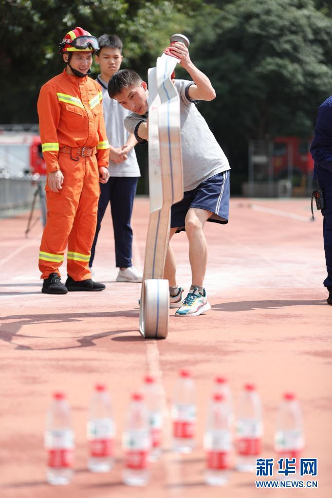 5月11日,在廈門(mén)大學(xué)附屬科技中學(xué)思明校區(qū),學(xué)生在消防員的指導(dǎo)下體驗(yàn)甩消防水帶。