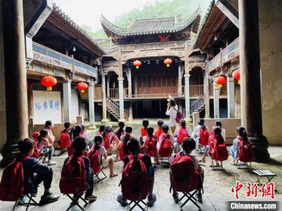 圖為孩子們在一處歷史建筑前接受革命傳統(tǒng)文化教育?!±蠲髅?攝