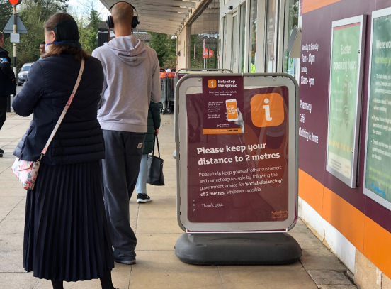倫敦民眾排隊(duì)進(jìn)超市,指示牌上寫著:請(qǐng)保持2米距離