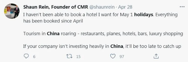 彭博社在報(bào)道的第一段就說:無論是國內(nèi)航班的機(jī)票,還是游樂園的門票,在五一到來之前,所有的票都快速售罄,這顯示出中國在后疫情時(shí)代的復(fù)蘇逐漸提速。
