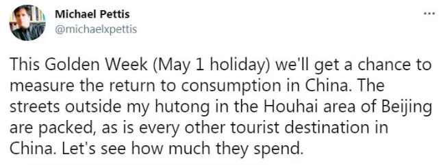 居住在北京后海附近的經(jīng)濟(jì)學(xué)者邁克爾·佩蒂斯說:“五一黃金周,我們將有機(jī)會測量中國消費(fèi)水平恢復(fù)程度。我家附近的胡同已經(jīng)人滿為患,就像全中國任何一個(gè)旅游景點(diǎn)一樣。讓我們看看他們究竟會花多少錢。”