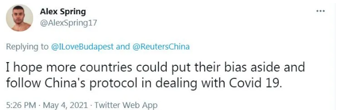 網(wǎng)友Alex Spring說,我希望更多國家放下偏見,參考中國的抗疫模式。
