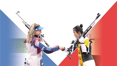 7月24日,中國射擊選手楊倩(右)在賽后和獲得亞軍的阿納斯塔西婭致意。 |