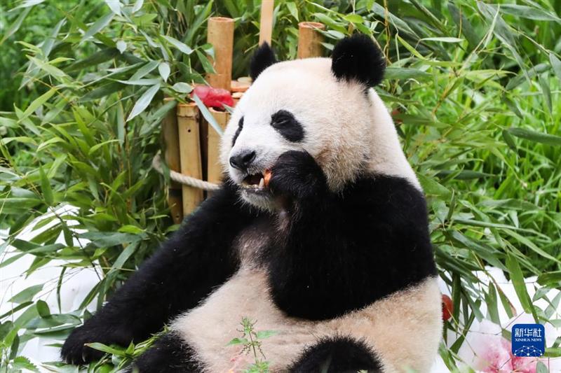 8月31日,大熊貓幼崽“夢圓”在德國柏林動物園享用“生日蛋糕”。新華社記者 單宇琦 攝