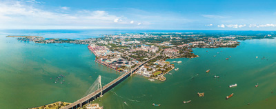 10月2日在海南儋州拍攝的洋浦大橋?qū)Π兜暮D涎笃纸?jīng)濟開發(fā)區(qū)(無人機全景照片)。