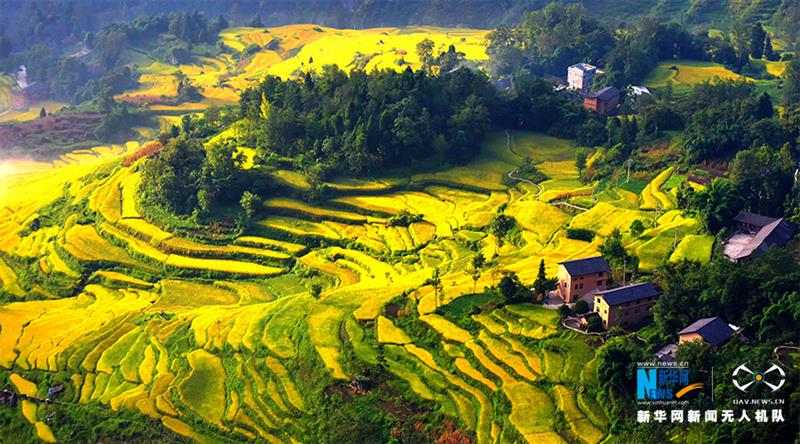 這是無(wú)人機(jī)視角下的花田鄉(xiāng)梯田,千畝梯田黃,秋色美如畫(huà)。新華網(wǎng)發(fā)(陳碧生 攝)