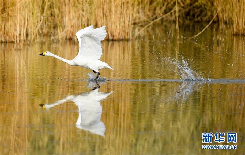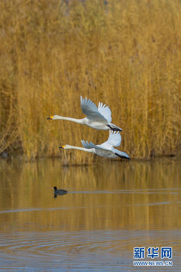 10月28日,天鵝在烏梁素海水面上飛翔。 眼下,大批向南遷徙的天鵝在位于內(nèi)蒙古巴彥淖爾市的烏梁素海停留覓食,為秋日的烏梁素海增添了一份靈動(dòng)。 新華社記者 徐欽 攝