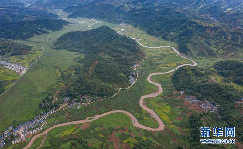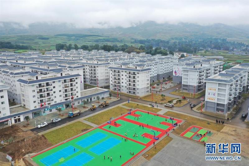 金陽縣山江鄉(xiāng)老寨子村易地扶貧集中安置點和通村公路(6月7日攝,無人機照片)。新華社記者 江宏景 攝