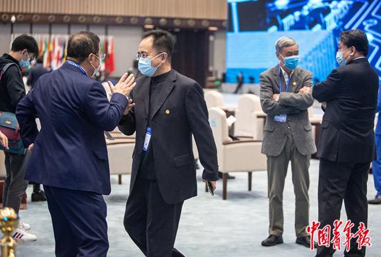 11月23日,浙江桐鄉(xiāng)烏鎮(zhèn),2020年世界互聯(lián)網(wǎng)大會·互聯(lián)網(wǎng)發(fā)展論壇開幕式即將開始,奇安信集團董事長齊向東(前排左)等參會嘉賓相互問候。盡管受新冠肺炎疫情影響規(guī)模縮小,本屆論壇仍有530余位嘉賓來到烏鎮(zhèn)線下參會。