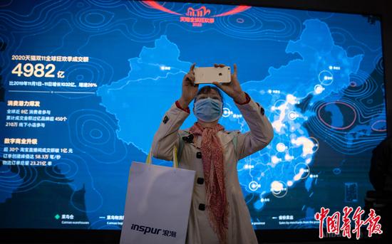 11月22日,浙江桐鄉(xiāng)烏鎮(zhèn),“互聯(lián)網(wǎng)之光”博覽會上,一位女士舉起手機拍攝現(xiàn)場盛況,她身后阿里巴巴、螞蟻集團展位的大屏幕正在播放今年天貓“雙11”成交數(shù)據(jù)的可視化圖表。