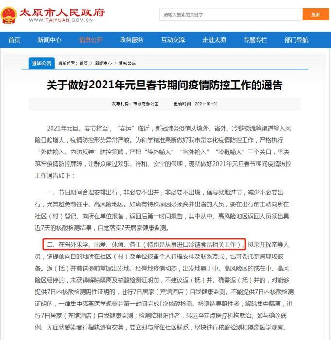 如山西太原市要求,在省外求學(xué)、出差、休假、務(wù)工(特別是從事進(jìn)口冷鏈?zhǔn)称废嚓P(guān)工作)、擬來并探親等人員,請?zhí)崆跋蚰康牡厮谏鐓^(qū)(村)及單位報(bào)備個人行程安排及聯(lián)系方式。