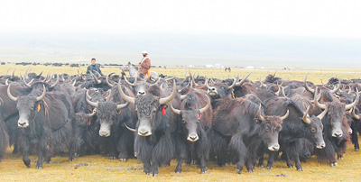 祁連縣牧民趕著牦牛群前往草場。 |