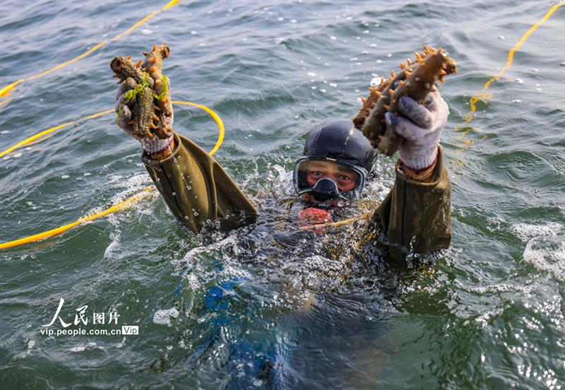 2021年4月20日,在山東省榮成市虎山鎮(zhèn)天海灣海參養(yǎng)殖海區(qū),“海猛子”在展示捕撈的海參。李信君攝(人民圖片網)