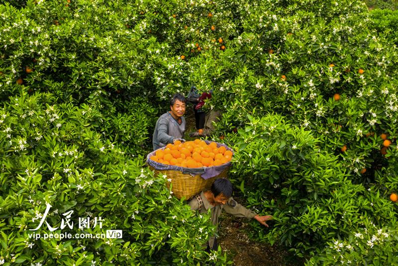 2021年4月19日,三峽庫區(qū)湖北省宜昌市秭歸縣郭家壩鎮(zhèn)煙燈堡村的村民正在采摘“倫晚”春橙。鄭坤攝(人民圖片網)