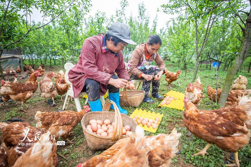2021年4月17日,貴州省畢節(jié)市金海湖新區(qū)岔河鎮(zhèn)塘豐社區(qū)400余畝林下生態(tài)養(yǎng)雞場里一派繁忙,村民們忙著收集、清理、分裝雞蛋,供應市場需求。羅大富攝(人民圖片網)