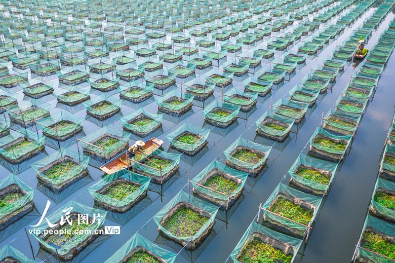2021年4月21日,廣東省廣州市白云區(qū)江高鎮(zhèn)硤石村鱔魚養(yǎng)殖基地,清清碧水間一排排整齊有序的“綠色網箱”春意盎然,養(yǎng)殖戶搖著小船給用來養(yǎng)殖黃鱔的網箱里種植生態(tài)水草。邱新生攝(人民圖片網)